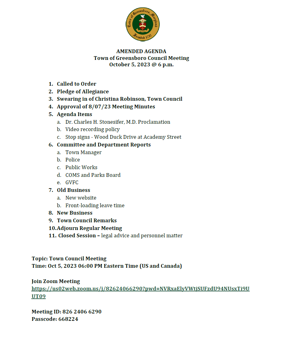 The agenda for each Town Council meeting is posted here when available and reposted when changes are made prior to the meeting.